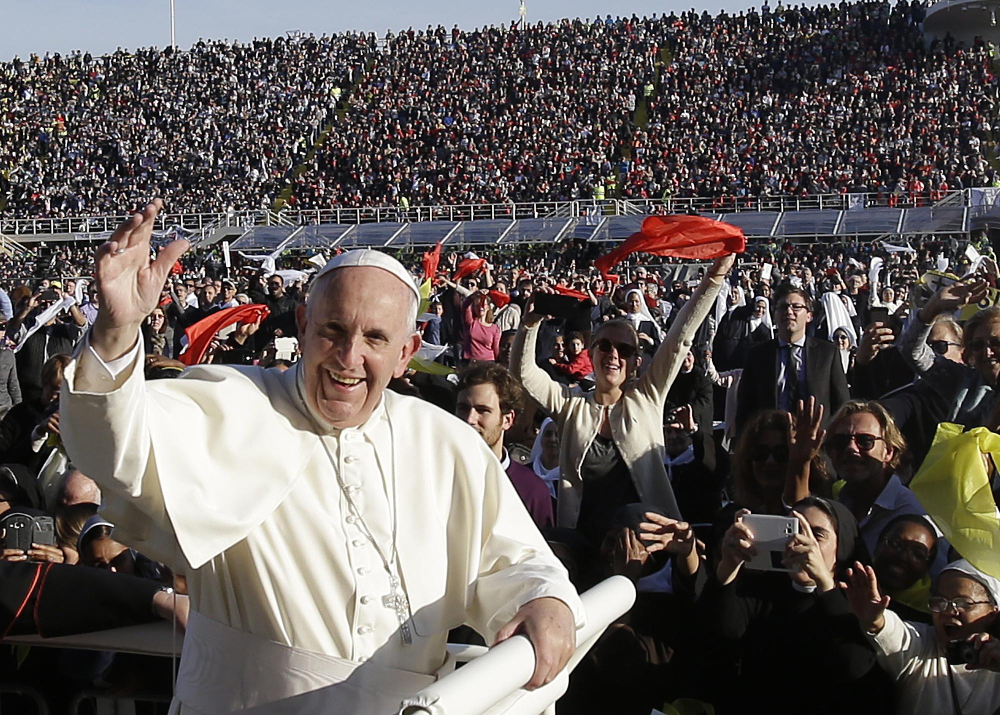 Il Pontefice in un momento del suo viaggio a Firenze incontra i fedeli all'interno dell'impianto che ospita le gare casalinghe della Fiorentina
