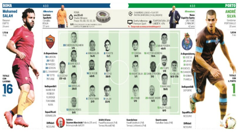 Roma, basta anche lo 0-0. Per garantirsi l’accesso alla fase a gironi della Champions League, alla Roma basta anche un pareggio per 0-0. Da parte sua, il Porto deve vincere o pareggiare segnando almeno due gol. Un altro 1-1 porterebbe invece le due squadre a disputare i tempi supplementari, ed eventualmente ai calci di rigore. |